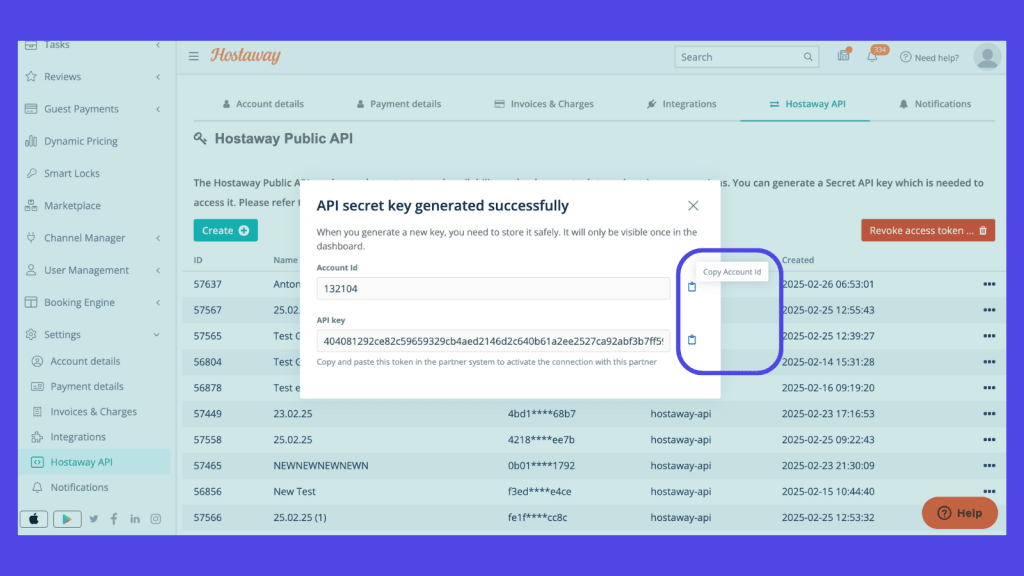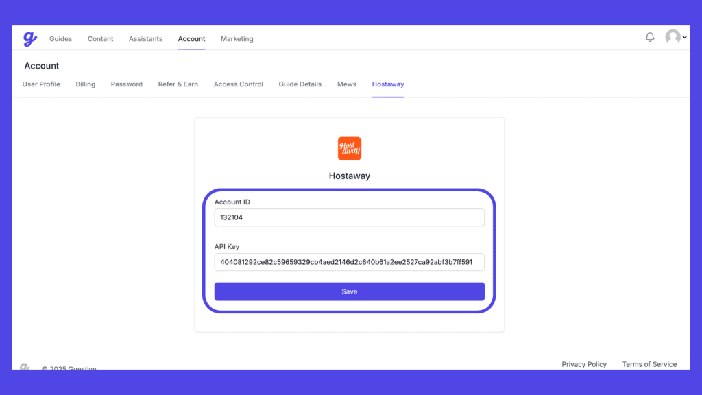 4) Copy the created details and navigate back to Guestive Account > Hostaway to paste them in: