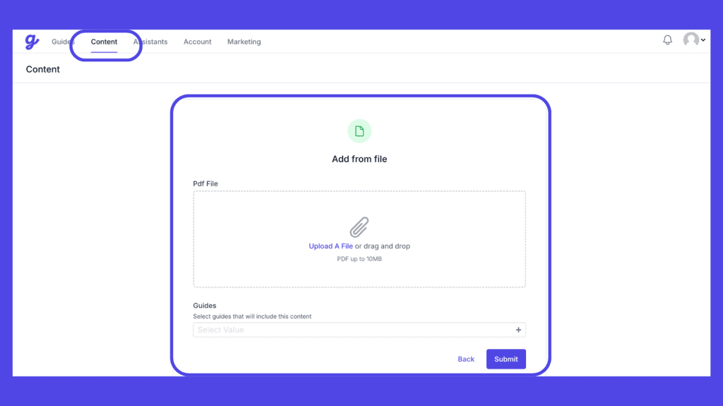 7) You can now add content to your guides which will also serve as a knowledge base for your A.I. the fastest way is to drag and drop a pdf with property details, the A.I. will automatically create a property knowledge base for you: