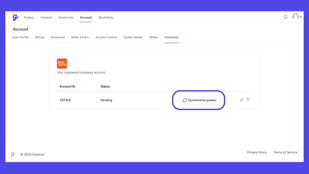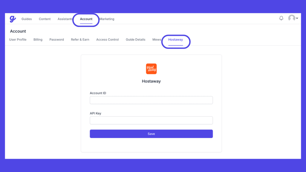 1) Sign up or login to Guestive and navigate to Account > Hostaway, this is where you will need to add your Hostaway credentials: